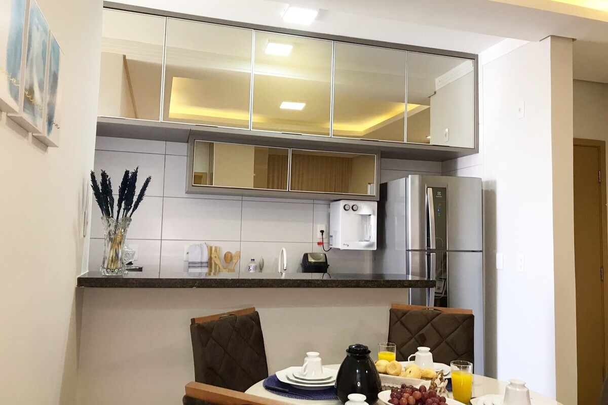 Flat Ribeiro's mission is to host people seeking a quiet and cozy atmosphere. New apartments, near the Airport, UFU College/medicine and essential services (bakery, supermarket, restaurants, transportation). It accommodates up to 3 people, 1/4 with a queen-size bed and a sofa bed in the living room. Bedroom with TV and air-conditioning, bed linens, towels, full kitchen, garage, broadband WI-FI, camera system in common areas, (washing machine - available for stays over 5 days).