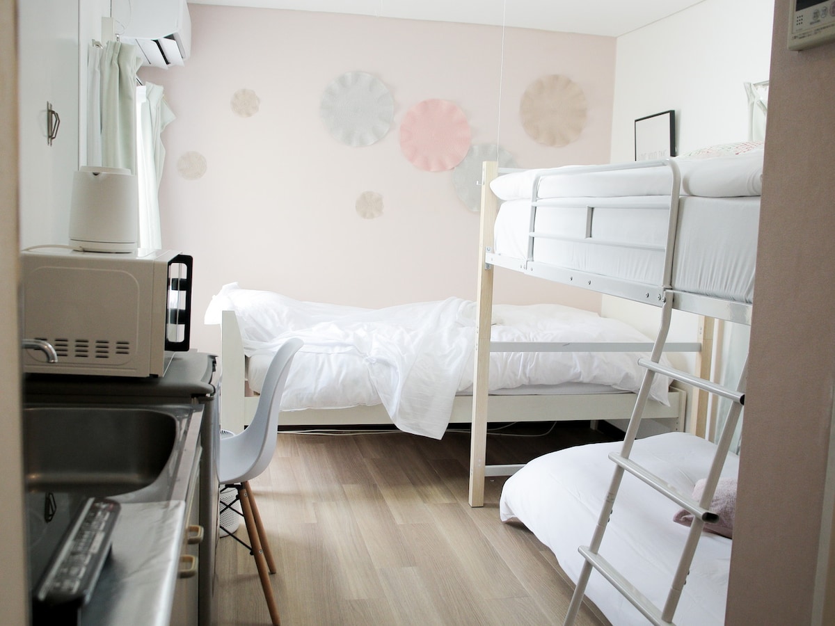 You can stay with other rooms, up to 14 people, please contact me in advance Room 202 in one room on three floors.(15m2) 2 guests, 1 bedroom with a double bed (✖️1.4m2m), 1 bathroom.A kitchen for light cooking is available.There are pots, cutting board, kitchen knife and cutleries.(Note: sauce not included) Microwave, refrigerator, washing machine etc are free to use and are not shared with others.(Exclusive for bath and bathroom) Due to the limited size of our home, please be mindful of guests with requirements for area and space.When reviewing, please do not comment 4 stars because of the small size,⭐️⭐️⭐️⭐️ thank you for your understanding and support]