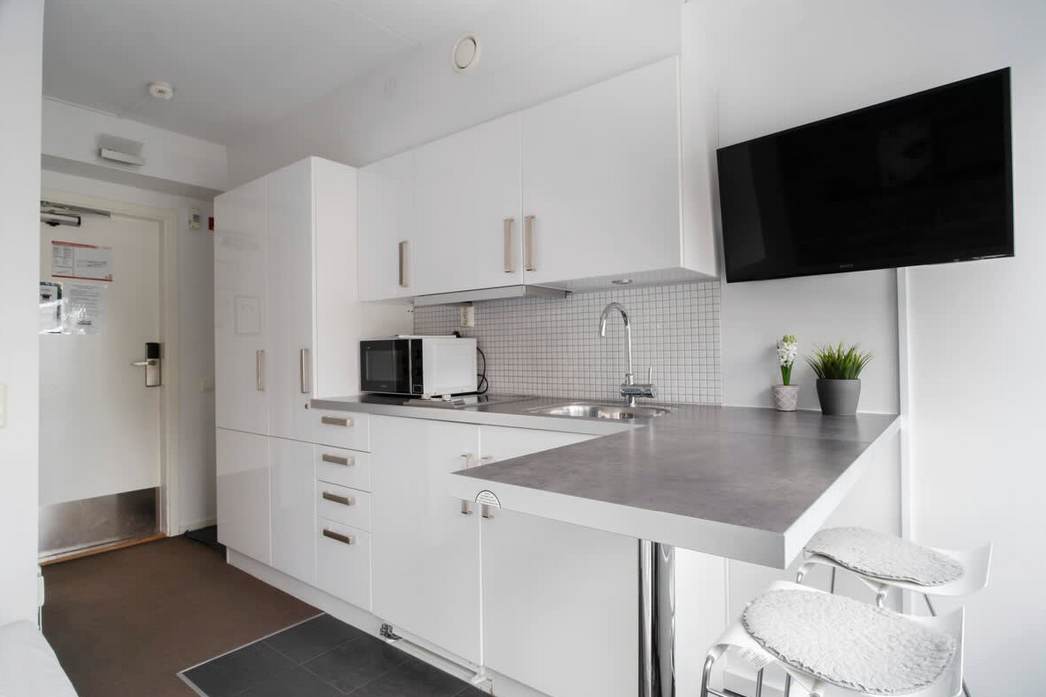 House (25 sqm). Private entrance, toilet, shower cabin & washing machine. The price includes bed linen, towels & final cleaning. One large room with a bed (140 cm), sofa (which can be used as a bed), desk. NO KITCHEN but there is a small refrigerator, micro & water boiler. As a hotel room - larger. Good storage and drying facilities. WIFI, TV with apple TV. Own part of patio. Not shoveled in winter. Parking space - by house. "Trixy" driveway up, due to road conditions.