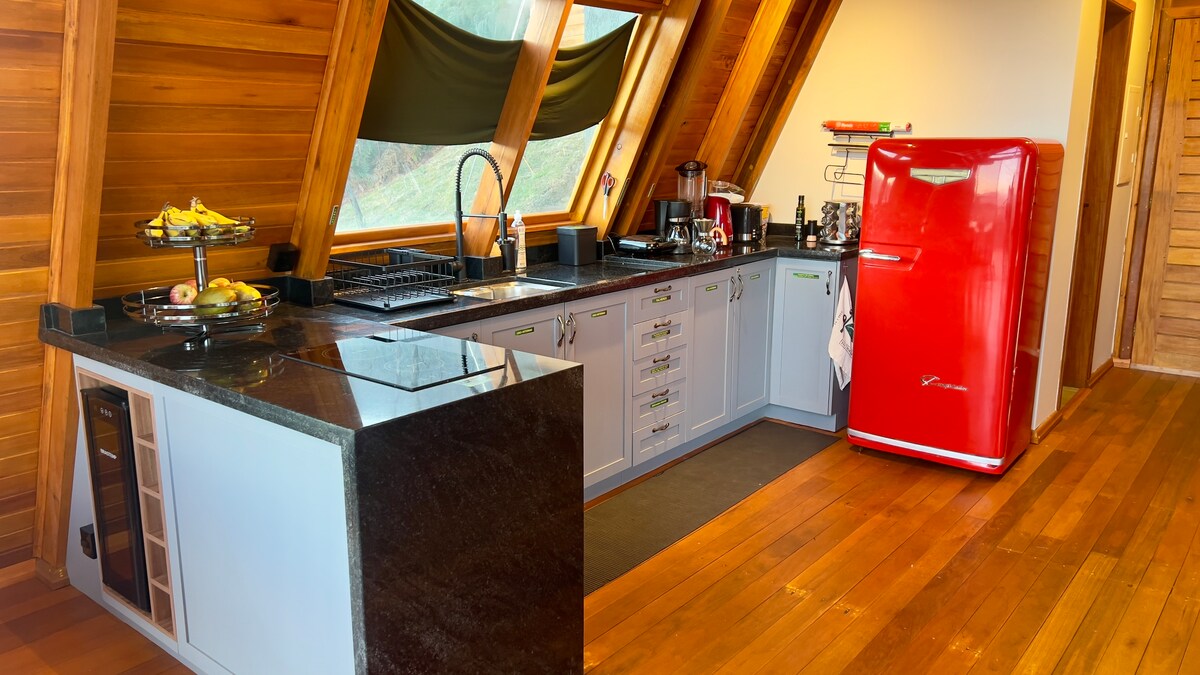 A haven of luxury and coziness in the heart of Serra da Mantiqueira, this A-Frame cabin was created for couples looking to disconnect from the world and experience unique moments. Relax in the bathtub overlooking the mountains, watch the sunrise or sunset from the deck, and feel the quiet energy of nature at its best. Enjoy an unforgettable experience in the midst of nature.