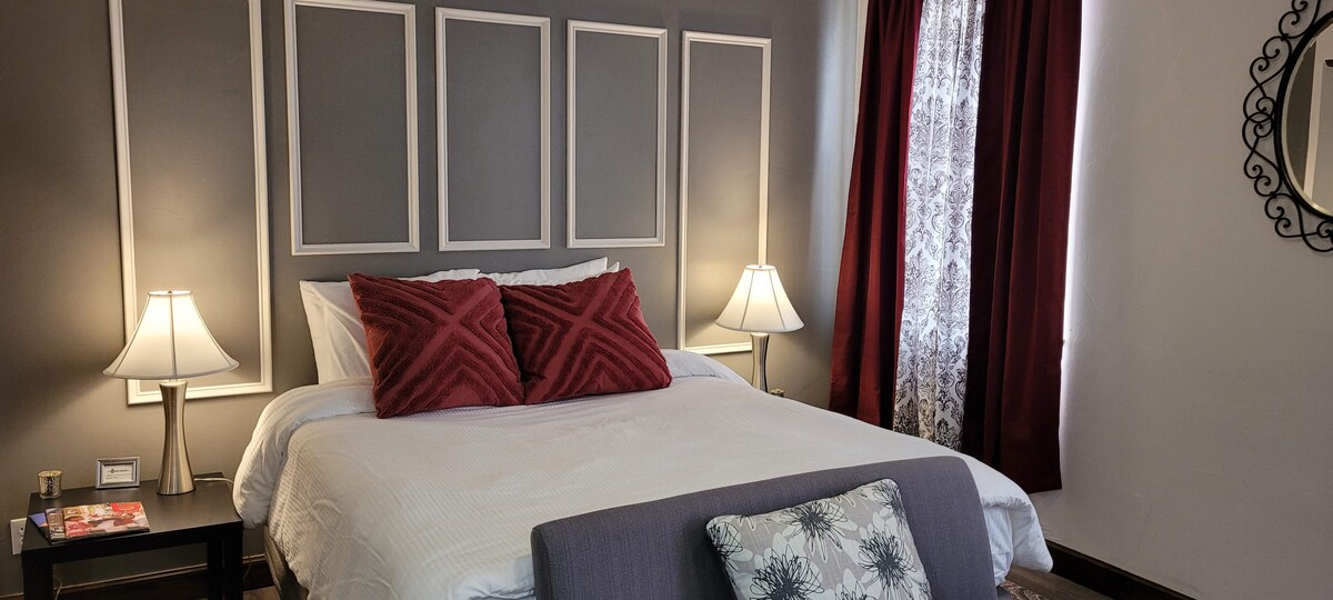 Luxurious and inviting, the Presidential Suite is defined by its deep red textiles and ornate details. This space is filled with natural light from the Missouri River views, as well as antique furniture pieces, a clawfoot tub, and a king size bed. The Presidential Suite is located in The White House Hotel, founded in 1868. Due to historical status, all guests must be comfortable with the stairs. Please note there is no elevator; all guest suites are located on the second + third floors.