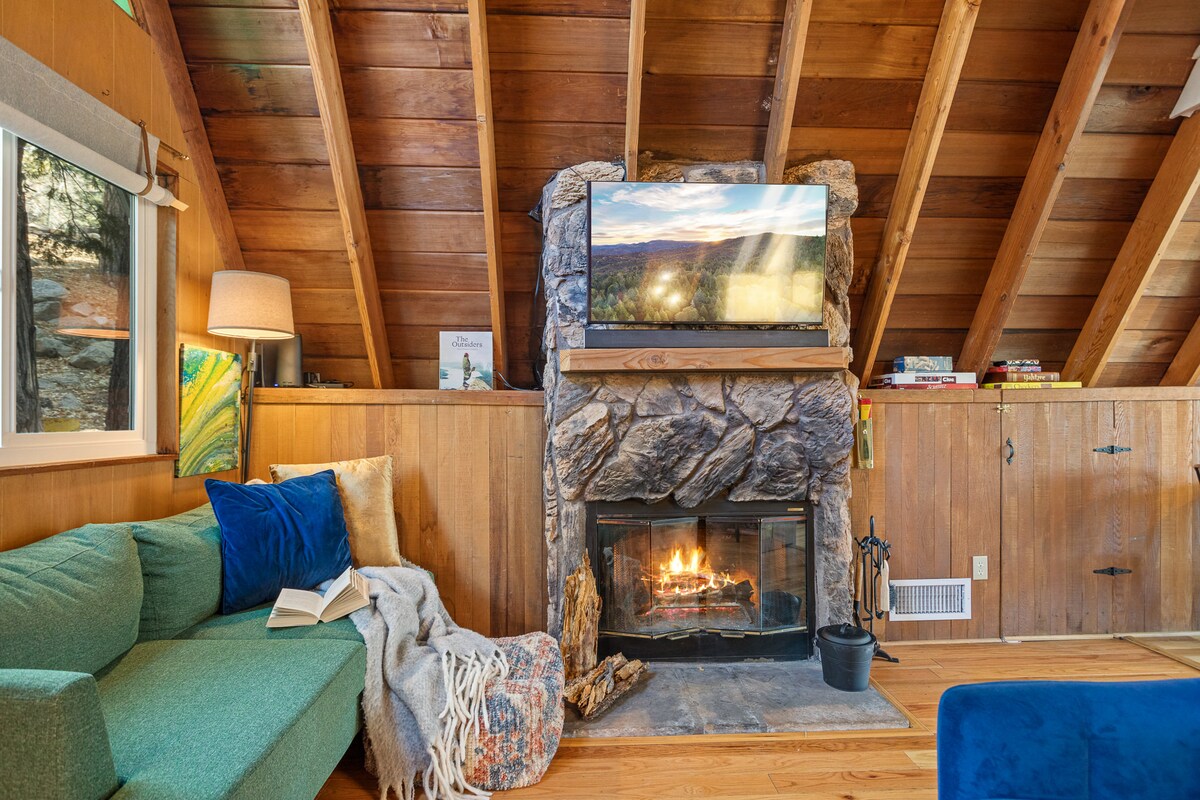 As you walk up stairs passing native boulders and trees, you see an A-frame cabin in the woods begin to peek out, inviting you. Once upon the front deck, the large pane windows draw you into this spacious, high-ceiling, open-concept cabin. Inside, these same windows that drew you in, will encourage the same gazing now, except outwardly. Tastefully designed and relaxing, you may not want to leave, though Big Bear, and Lake Arrowhead all beckon within 30 mins drive... Welcome to The Scandia 🦌
