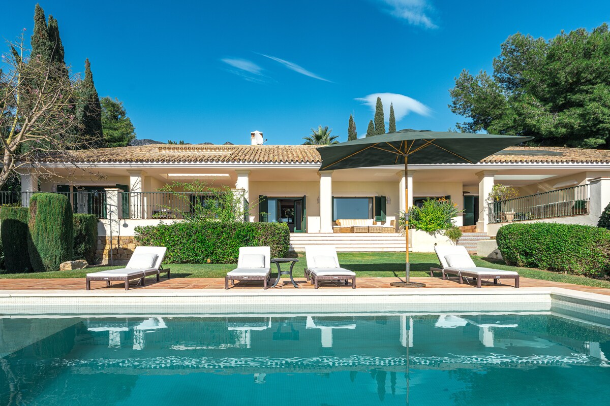 This is our beautiful home. After living in Marbella 6years we moved on, to Paris. The house is recently renovated and it's really cozy and elegant. Everyone says, "Your house feels like home!" We have 4 kids, so the house is great for families (ping-pong table, puzzles, table games, doll house etc.). Your kids will have so much fun in pool! You can walk 20minutes to the gorgeous Marbella old town and sandy beach. I would be happy to recommend you family friendly restaurants and playgrounds.