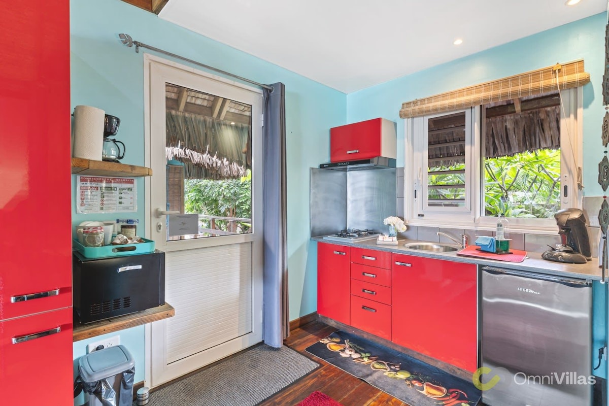 Moorea, exit from Cook's Bay, our bungalow for 2 (+BB Ok if you are equipped) is located on the grounds of our family home. Romantic and comfortable (air conditioning, QSize bed, kitchen, shower room, toilet, private terrace) it faces the lagoon view and shared spaces: tropical garden, swimming pool & barbecue area. If you wish, we will gladly share tips, tricks, moments with our family and our super dogs. Bubble spa option available on your private terrace.