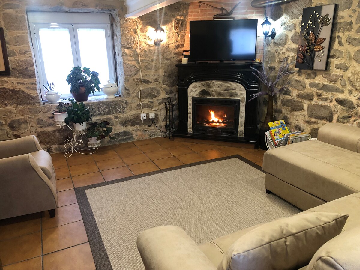 We have eight seats, three bedrooms, a living room with a fireplace, a kitchen and three bathrooms, as well as a beautiful patio, porch and 2000 m of enclosed and fenced land for pets, a barbecue and a beautiful swimming pool. Our cozy house is 15 km from Santiago in the middle of the Camino de la Plata, 300 meters from the last hostel. We are located on Pico Sacro (sacred peak) from where you can see the entire region. Ideal for enjoying nature, tranquility, and a perfect location for excursions.