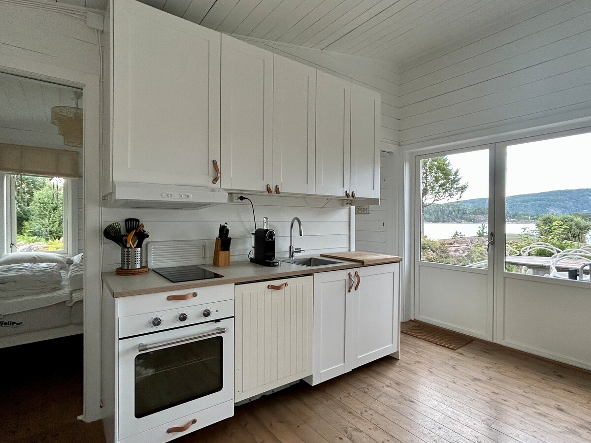 Sjarmerende sommerhytte som ligger helt for seg selv i vakker natur. Dette får du: Oppvarmet basseng, 5x12m, badehåndklær, drivhus med sittegruppe, gratis wi-fi og gratis parkering og el-bil lading. Hytta har 4 m skyvedør av glass med utsikt til terrassen, bassenget og Oslofjorden. Hytta består av to rom. Ett soverom med dobbeltseng og et kjøkken/stue med sofa. Separat baderom. Full utsikt til Oslofjorden. Ingen naboer, bare vakker natur og lyden av fuglekvitter og skvulpende sjø. Velkommen.
