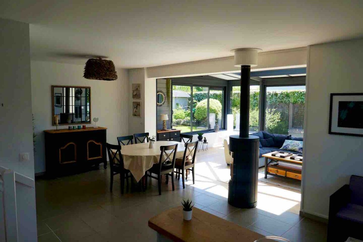 Located a 300-meter walk to the beach, 135 m2 house in a reassuring and relaxing setting. 3 large bedrooms, 1 bathroom with toilet, shower and large bathtub. A large living space in a modern decor, a cozy atmosphere, comfortable kitchen "dishwasher, oven, microwave, large fridge with freezer" a separate toilet, a large relaxation room with sofa, TV, games, foosball. Outside, 300 m2 not overlooked, terrace with outdoor table. Optional linens.