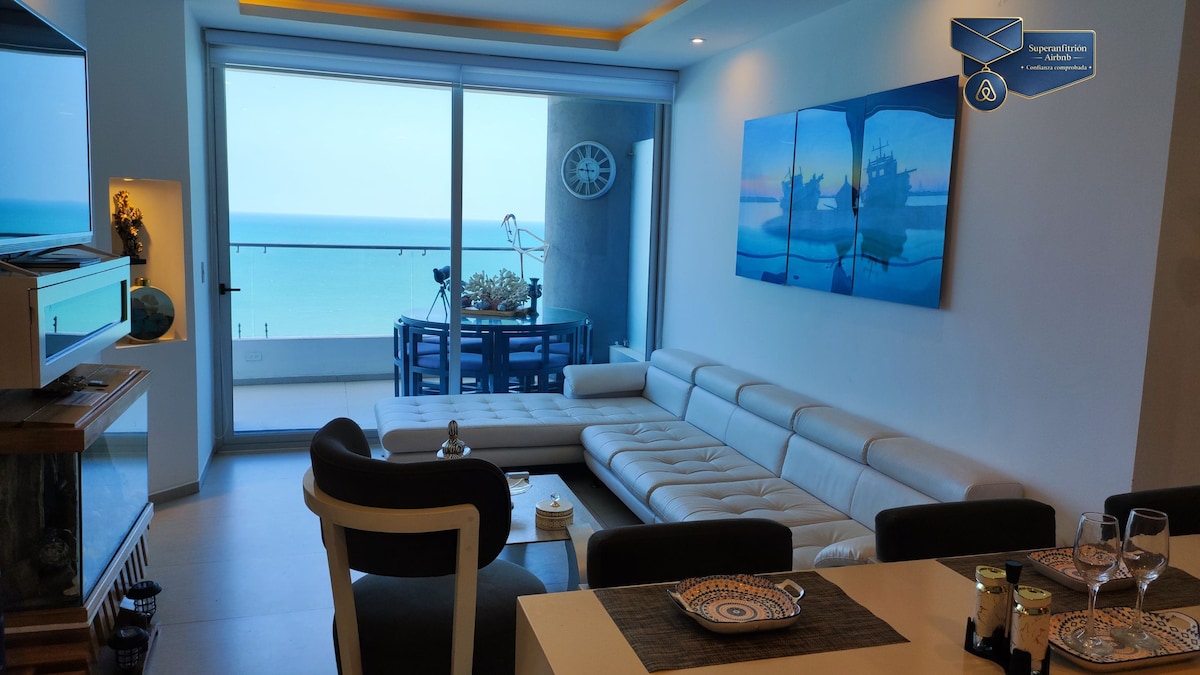 Departamento de Lujo para 9 personas - 2 Dormitorios, Piscina y Más ¡Departamento con AIRE ACONDICIONADO! 2dormitorios 5 camas. Cocina equipada 2 baños Parqueadero privado. Máster cama 2.5 plazas Dormitorio 1 cama 2 plazas en litera arriba 1,5 plazas también encontrarás un sofá cama. En la sala también tienes un sofá cama Tienes TV en cada area Amenidades: piscina, jacuzzi, sauna turco. Perfecto para familias o grupos. A 3 cuadras de la playa ! Conjunto súper privado Seguridad 24/7