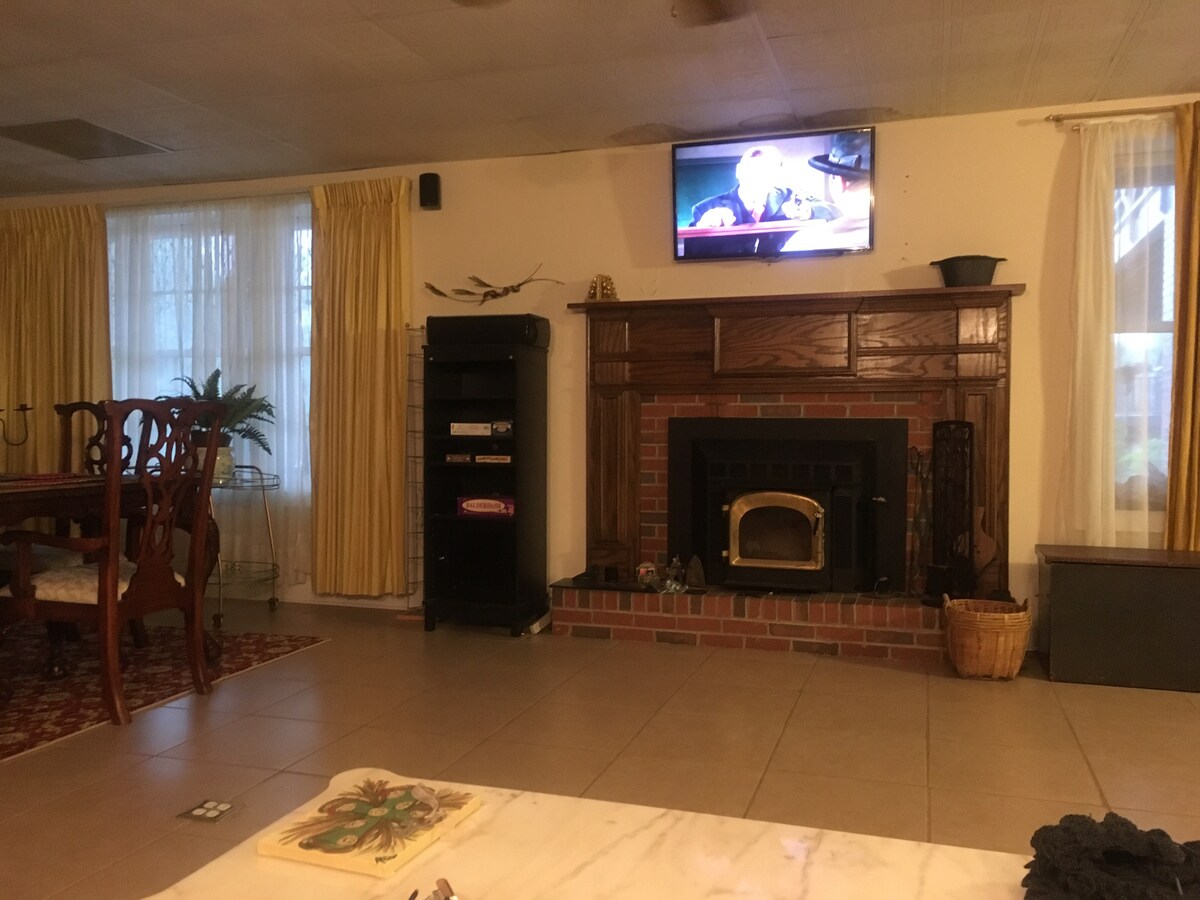 Cozy&creative 2 rooms + bath, clean is a priority. Living Room has feather cushioned couch, 3 chairs, table, desk, Med. size frig/freezer, microwave, toaster & toaster oven, coffee maker & supplies. YES WI-FI & 31" TV. NO KITCHEN.4 steps lead to lower level bedroom w/ Blockout curtain at doorway, 1 closet & bathroom. Full size bed. Shower head projects from stair case angle. Low ceilings. Private patio at your exterior door w/ a front yard parking pad. Emergency exit at top of stairway.