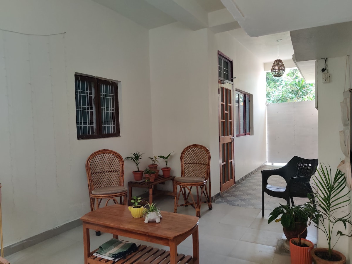 Set in lush green surroundings you will get a farmhouse feel with beautiful gardens and orchards. In the garden we have many fruit trees and seasonal organic vegetables. It is a ground floor unit with one small bedroom along with a private kitchen, a bathroom along with a private verandah where the guests can sit and enjoy nature while sipping on hot tea. It is a perfect fit for solo travelers on a budget.