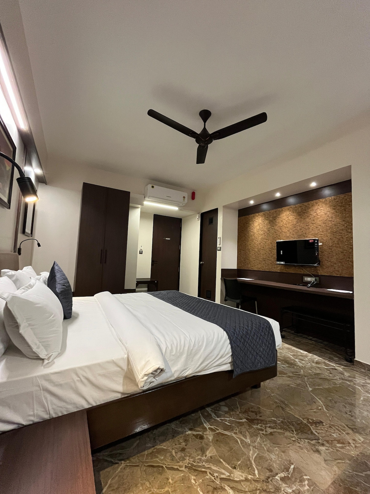 Experience the ultimate in luxury & Comfort at 'Varuna' studio unit. 305 Sq.ft unit of meticulously designed space,providing a perfect blend of style and functionality.This exquisite Suite comprises spacious AC Studio room with Pantry Kitchenette & Attached Toilet. Kingsize bed+single bed+chair. Common RO water purifier in lobby. It DOES NOT HAVE LIFT to access 1st floor. Reception & waiting area on G.floor+24hr Power backup+Carparking+close to pune-Hyd highway. 1 of the 4 Units by Kuber Suites.