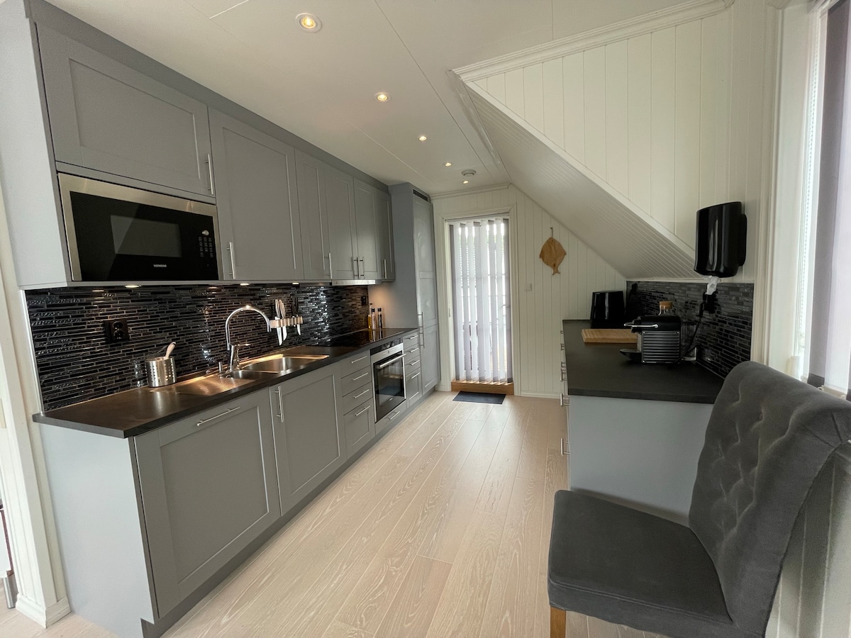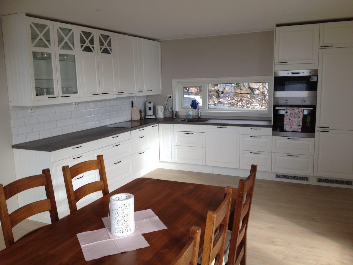 A Nordic cabin built in 2017. Large terrace with outdoor furniture and an campfire pan for cosy nights. Parking space for at least 3 cars outside. Lovely modern, but worm interior with Scandinavian design. 3 bedrooms and 2 bathrooms. Big windows in the living room, and on the frontal wall of the master bedroom. This makes for a breath-taking and romantic view. A good size bathroom and walk-in /nursery is attached to the master bedroom on the top floor. This floor is well suited for couples.