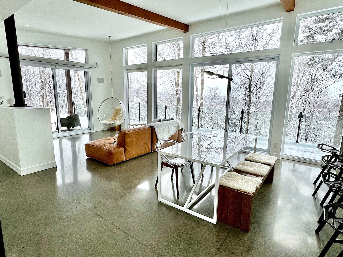 *$* WINTER PROMOTION *$* For a weekend reservation (Fri. & Sat.) the 3rd night on Sunday is $90.00!. Monumental open concept, in the heart of nature. Access to trails directly behind the house. Wood stove, large modern bathroom, one bedroom + sofa bed. Another sofa bed in the living room. Ideal chalet for a couple with children or two couples. Wild birds, turkey, and deer lovers welcome! Wifi and EV charger included. Dogs Welcome! CITQ : #308038