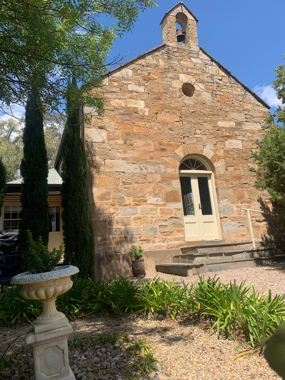 . Stylish unique & spacious heritage retreat- 2 bedrooms 2 bathrooms sleeps 4 . 300m walk to Main Street, cafe’s, wine bars, Restaurant, hotels . 600m to the Riesling trail . Wifi, smart tv, work station The unique historic chapel has comfortable couches & beds. Fully equipped kitchen, microwave, stove, dishwasher, stainless steel double fridge, coffee pod machine. Washing machine. Wood fire & Reverse cycle air conditioning to all areas. Outdoor area with WeberQ, table chairs & umbrella.