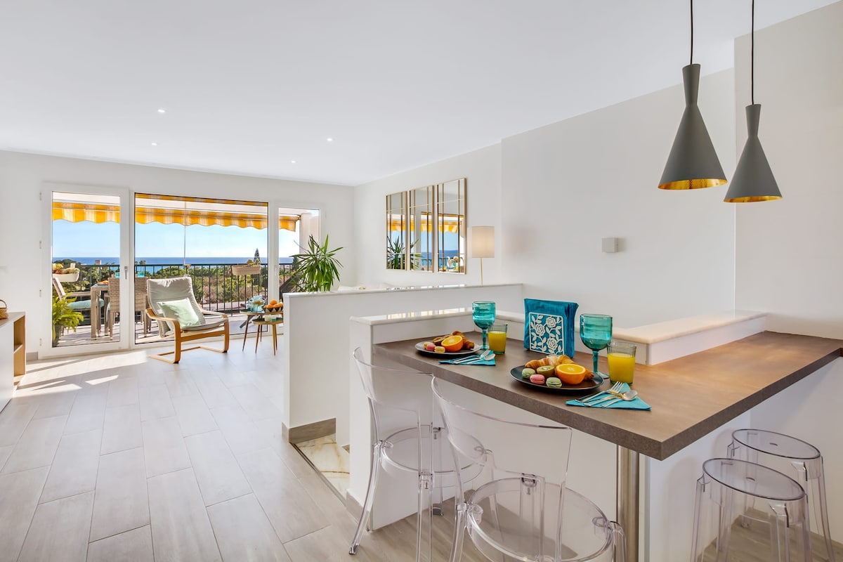 Spacious duplex with AMAZING SEA VIEWS, 100% refurbished with everything brand new. 2 bedrooms, one of them with King Size bed , 1 bathroom & a big living room with open kitchen. Nice terrace with espectacular views. 12 minutes away by walk from Carihuela Beach (3 min by car) and 15 minutes away from Málaga city. Excellent train connections with Malaga Airport and AVE Station (stop: Montemar Alto). Quiet area with nice gardens and swimming pool.