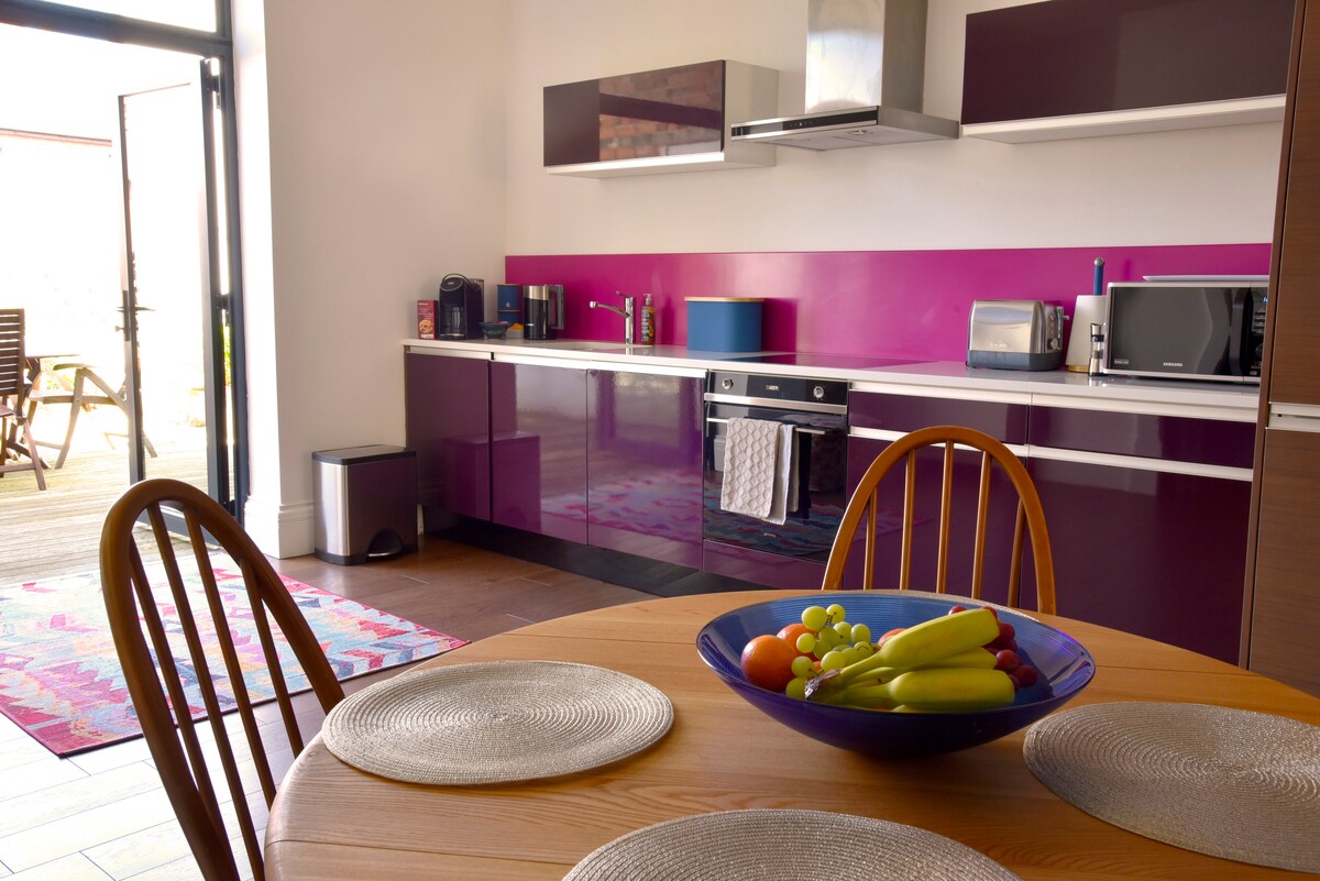 Awarded 'Top 5 National Airbnb Host Awards for Design' and in the 'Top 1% Airbnb' globally in 2024, our 3-bedroom penthouse in Leicester's Cultural Quarter is ideal for families, couples, business travelers, and reunions. Enjoy a sleek, open-plan mid-century style with breathtaking floor-to-ceiling glass walls and a serene treetop ambiance. Just a 5-minute walk from theatres, restaurants, cafes, and entertainment. Book now for an unforgettable stay with stunning views and top-tier amenities.