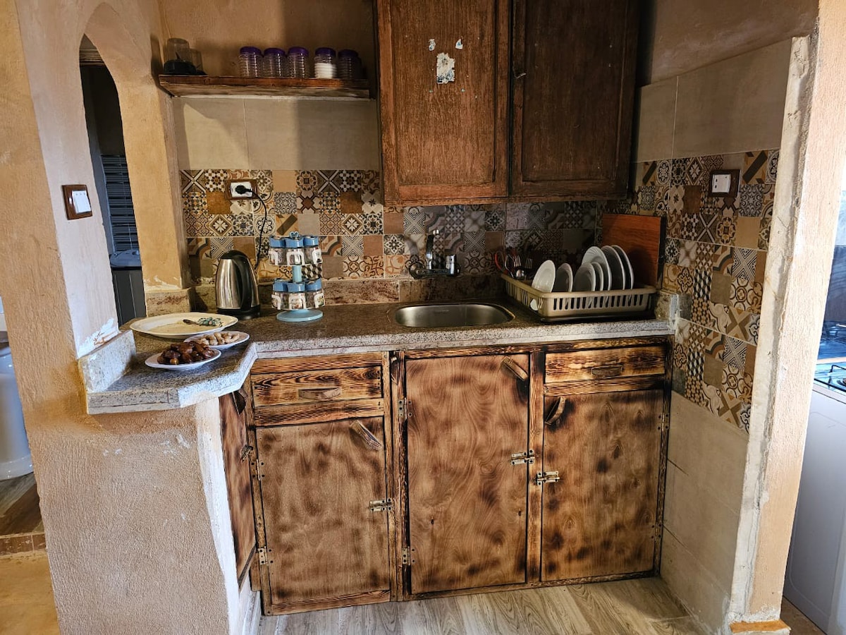 Step into a warm, wooden cozy apartment designed for comfort and relaxation. Surrounded by natural materials and soft lighting, this space offers a peaceful retreat after a day exploring Siwa. The apartment features a comfortable bed, a sitting area, and thoughtfully selected décor that blends nature with simplicity. Ideal for couples or solo travelers seeking calm, privacy, and authentic oasis vibes.