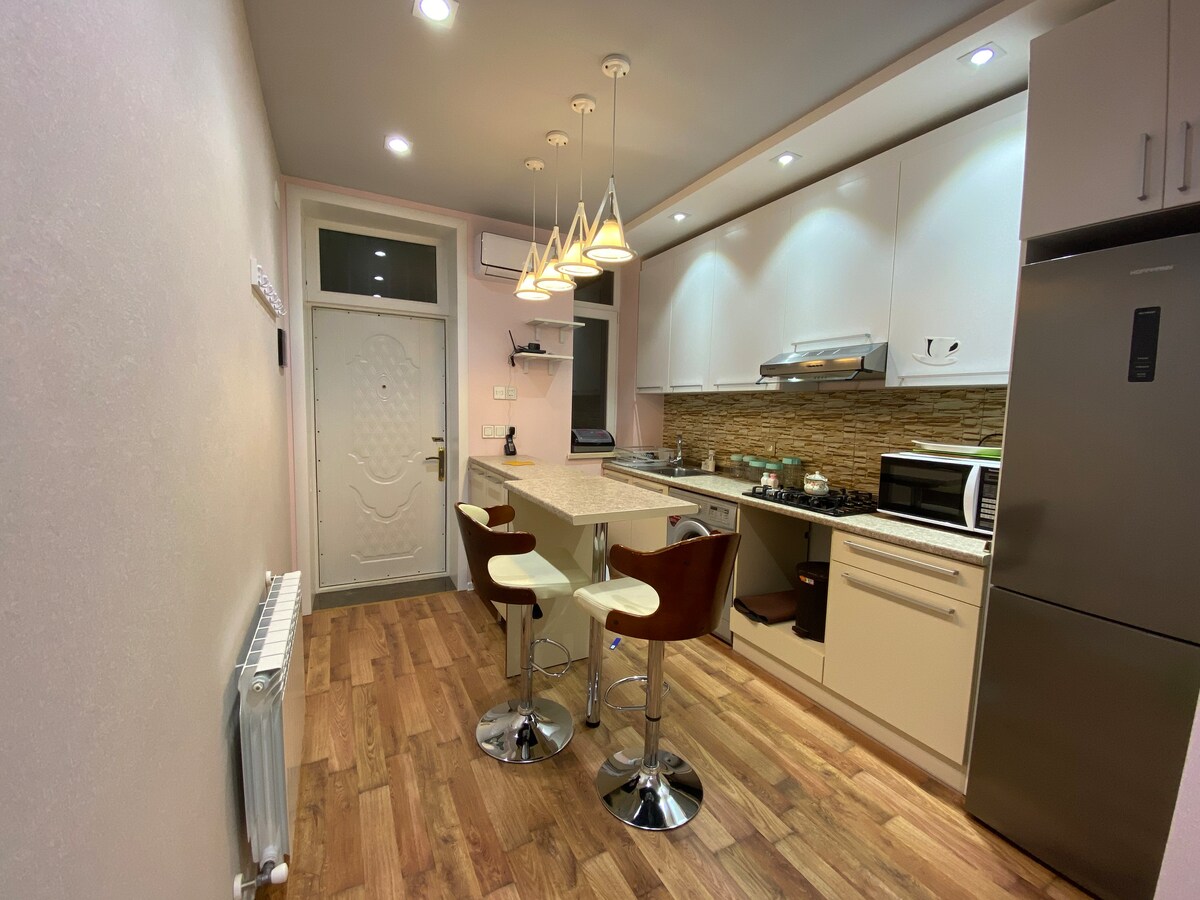 The apartment is in a historic/architectural building right in the city center near the Hilton and Marriot hotels. A cozy 2-room apartment with a total area of 45 square meters with a fresh designer renovation. 3 minutes walk from Sahil metro station, 6 minutes from the fountain square, 3 minutes from the seaside boulevard.