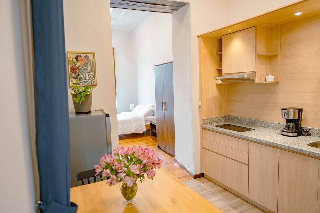 A solo pasos del tranvía de Cuenca, en la encantadora calle Tarqui, cerca de las iglesias más históricas de la ciudad y a solo dos cuadras del icónico Parque Calderón—hogar de los mejores bares y restaurantes—se encuentra Tarqui Suites. Ubicada en el primer piso de este edificio histórico, tu suite privada cuenta con todo lo necesario para una estancia cómoda, incluyendo baño privado y cocina completamente equipada. Disfruta de una estadía elegante y conveniente en el corazón de Cuenca.