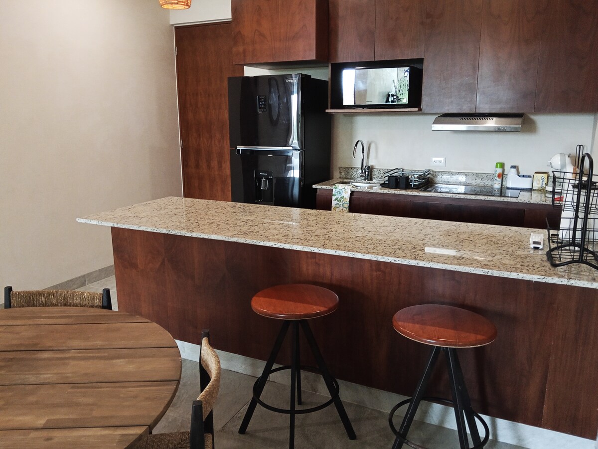 Experience the magic of Bacalar in our beautiful apartment, fully equipped and decorated in a tropical contemporary style. 1 bedroom with a king-size bed, living room with sofa bed, private terrace, dining table, full bathroom, equipped kitchen, air conditioning, 2 Smart TVs, and high-speed WiFi. You will also have access to the rooftop, where there is a large pool with spectacular views of the lagoon and the jungle. If you are a light sleeper, you may notice some noise from the nearby road.