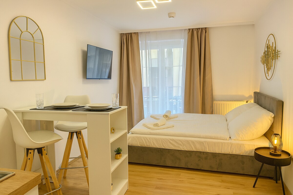 Dieses stilvoll eingerichtete Apartment wurde kürzlich renoviert und bietet besten Komfort für deinen Aufenthalt. Freue dich auf eine gut ausgestattete Küche, einen eigenen Balkon sowie einen kostenlosen Stellplatz in der hauseigenen Tiefgarage – alles inklusive. -Bequemes Doppelbett mit frischer Bettwäsche -Küchenzeile mit Mikrowelle -Kostenlos Kaffe und Tee -Smart-TV und kostenloses WLAN -Gemütlicher Balkon mit Sitzgelegenheit -Bad mit Dusche, frischen Handtüchern, und vieles mehr