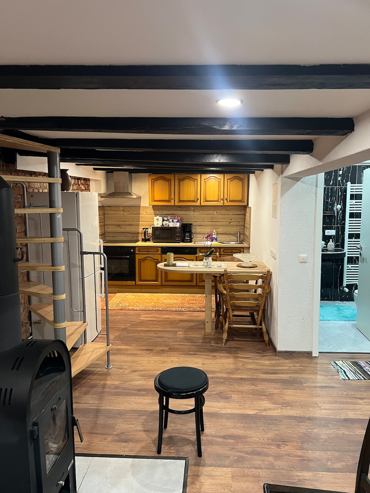 We live in the countryside with lots of greenery and fresh air, a free spirit and are open to guests. The bakery with traditional furnishings, wood-burning stove, sleeping loft and timeless comfort is located separately on the property. Next to the residential building (40 m away) is the modern bathhouse for the exclusive use of our guests. In our house, we read a lot, philosophize, drink good wine and take care of the essentials in life, pure reduction! Adventure instead of luxury.