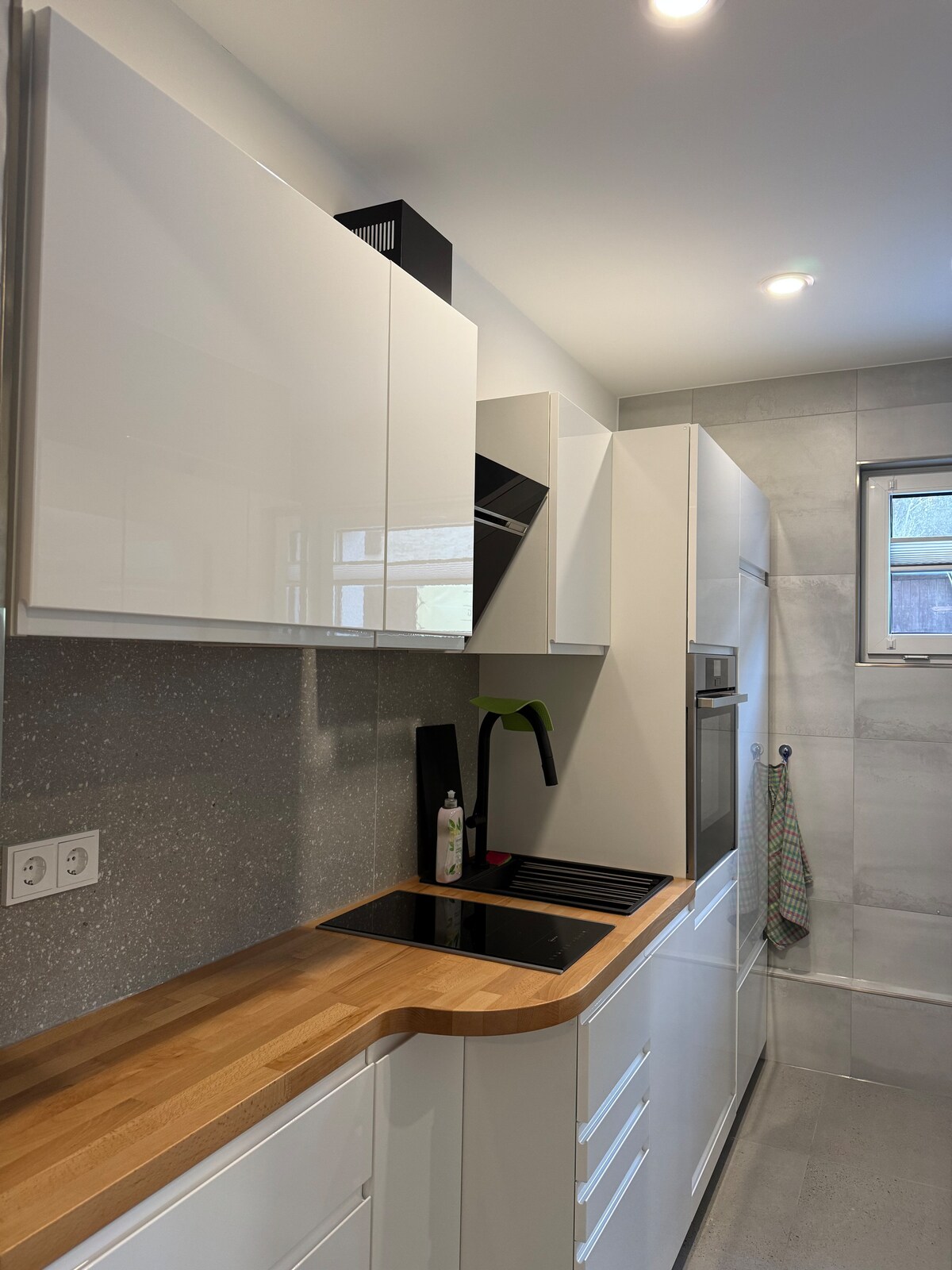 30 sqm apartment in a renovated two-family house Entryway Main room 1.60 m bed, couch (with sleeping function in 1.30 m width), dining table designed as a sideboard Kitchen fully equipped (premium appliances, coffee, tea, drinking chocolate for free) Opposite the double vanity To the left of it is the entrance to the open rain shower To the right of it is the toilet (lockable door) Electric shutters in the main room & toilet Pleated blinds on all windows Vehicle(s) can be parked directly in front of the property (dead end)! Yard not yet renovated