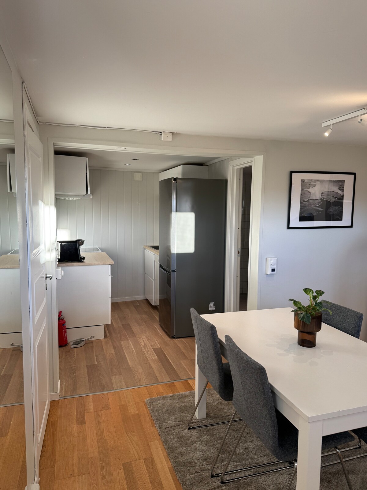 Unique and nice apartment with beautiful south-facing views of the lake and Kalvøya. Centrally located close to Sandvika city centre. 10 min to the train, stores, cinema and restaurants. Walking distance to Kalvøya and Sjøholmen. Cozy and undisturbed villa area. The apartment is newly renovated and is located on the ground floor in Casablanca, a beautiful funky house. It is a lovely studio apartment (45 m2) with a bedroom in the living room, but also with a sofa bed in the kitchen and the workroom area. Private patio and parking space.