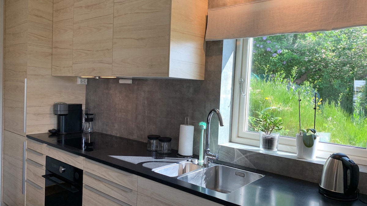 Recharge your batteries in this unique and quiet place. A bright and airy, newly renovated small home (40 sqm) with a queen size bed (150 cm) and a queen sofa bed (150 cm), a fully equipped kitchen and a bright bathroom. Free parking. Garden right outside with a stunning view. Feeling of being in nature and only 15 minutes by train to Oslo city center. Sandvika city center and surroundings are also worth exploring. There is a large shopping mall, beaches and hiking areas nearby.