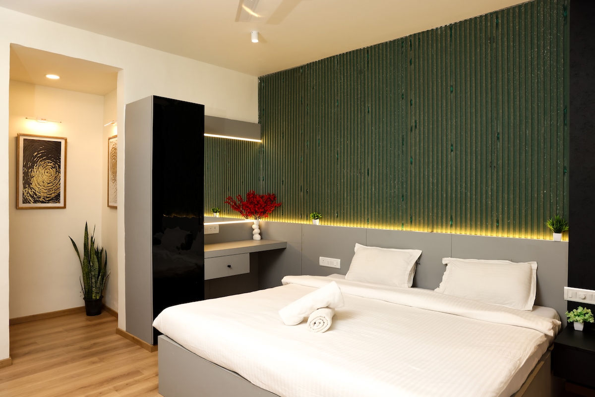 Modern Boho Apartment | Minutes from North Goa's Beaches.A cosy, fully furnished 1BHK retreat perfect for couples, friends, or small families. Highlights: - Stylish boho interiors with a warm vibe - AC in bedroom & living room for comfort - Smart TV + High-speed WiFi - Equipped kitchen with RO water, cooktop, fridge & washing machine - Shared swimming pool (9 AM–6 PM | swimwear mandatory - On-site gym available as a paid facility - 24/7 security for peace of mind - Free Parking