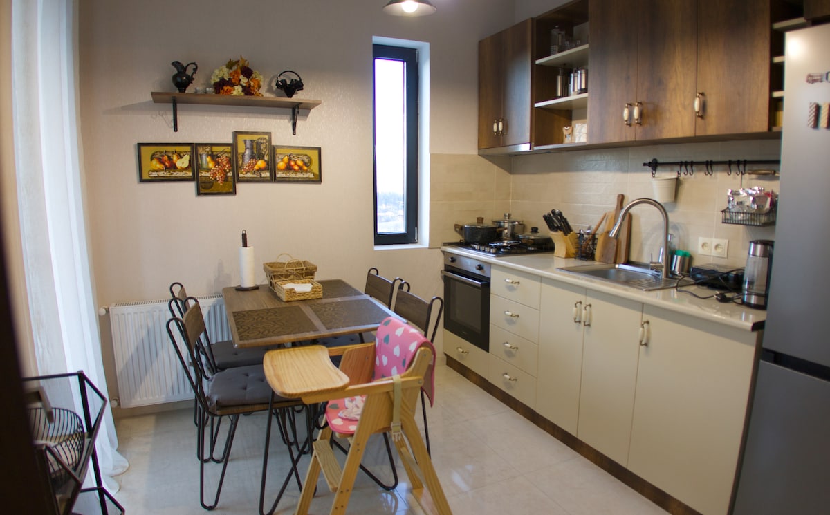 Welcome to our beautiful two-story house . The house offers stunning views of the surrounding hills — perfect for nature lovers and anyone looking for peace and relaxation. Just a 10-minute drive from the city center, our home features 3 bedrooms, each with a private shower. Every bedroom also has its own balcony. The first floor is a spacious studio-style living area with a fully equipped kitchen (fridge, microwave, oven, blender, and meat grinder), a cozy fireplace, dining and lounge areas.