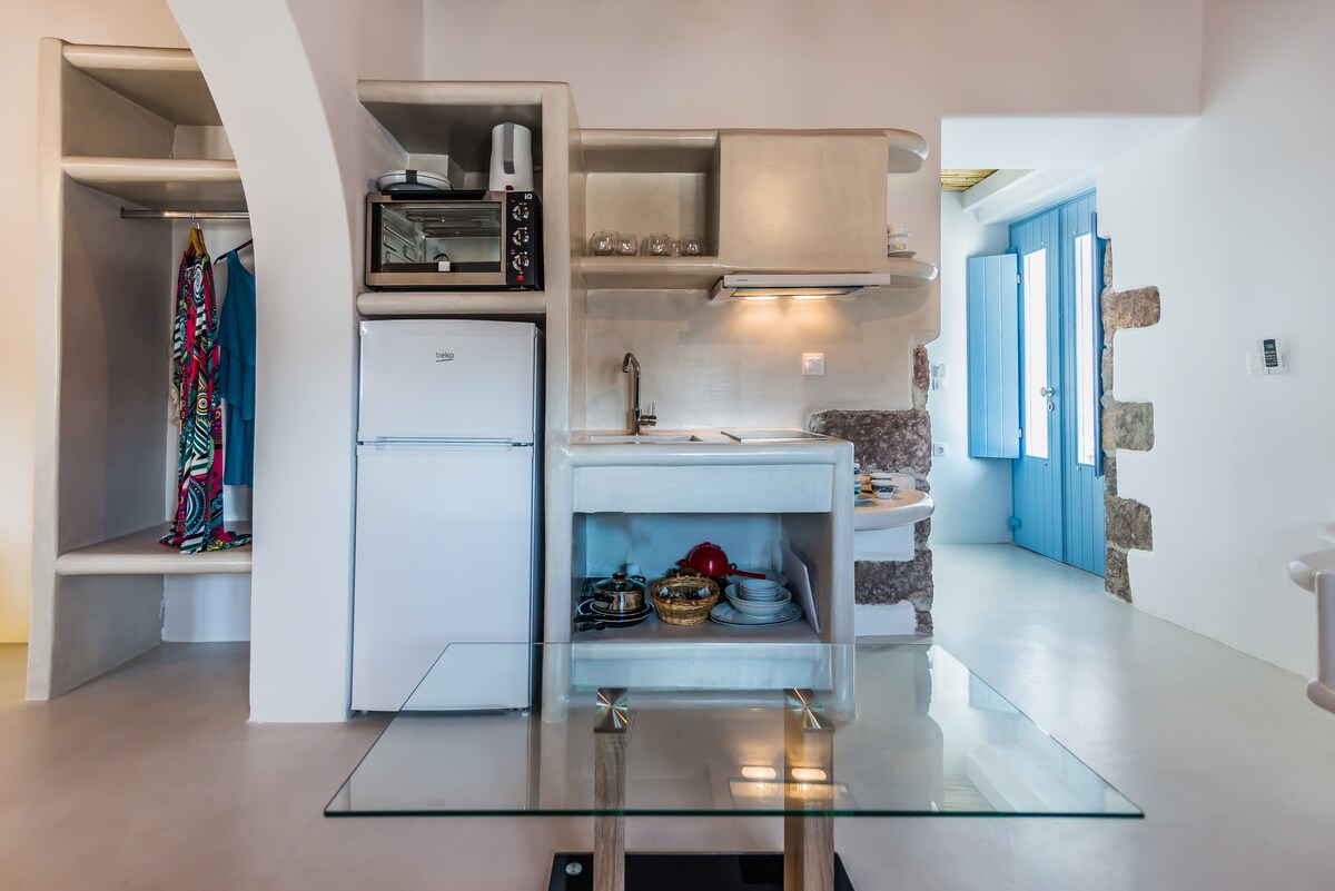 It is the downstairs floor appartment of a 1949 building fully renovated (2016) , situated in the heart of Milos' capital, Plaka, a traditional and picturesque village. It comprises two double bedrooms, living room with two sofa beds, kitchen, spacious bathroom and a balcony with great view to 5 mainland villages, Plaka, Plakies, Triovassalos, Pera Triovassalos and Tripiti. You shall be fascinated by the suite's combination of modern and traditional architecture.
