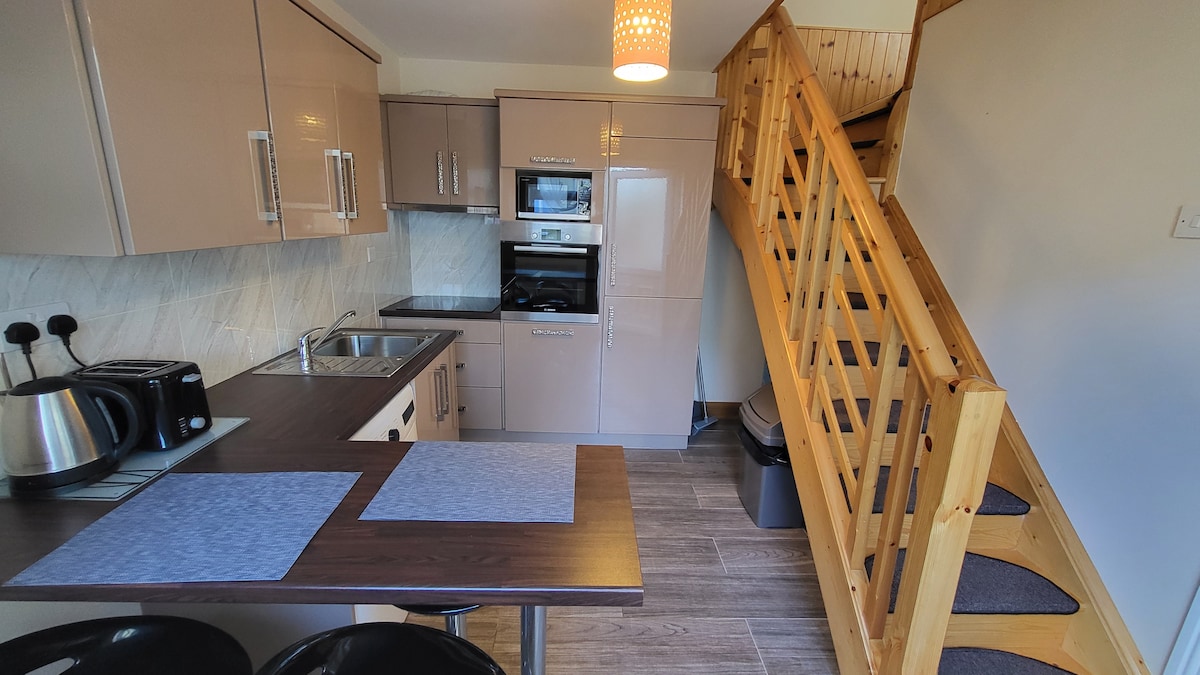 1-4 people 15 mins walk or 2 mins drive to town centre. Ennis-Shannon 15-20 mins drive. It is a separate building at the back yard of the main house. The kitchen is on the ground floor and up stairs are 2 bedrooms and the bathroom. Tea & coffee, shower gel, shampoo & conditioner also the bed linen & towels will be provided. Crib/cot, feeding/high chair available by request. Smoking only outside. There is free parking space available & free WiFi.