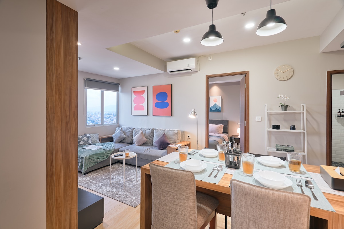 Embrace the minimalist lifestyle with this 2 bedroom apartment, located in the breathtakingly beautiful downtown of Bandung. This unit features : - Fast internet - 2 AC - TV (include netflix) - Water Heater - Hairdryer - Iron - Fridge - Kitchen Set - Free indomie and water (2 indomie & 2 mineral water/night) Look no further for the perfect place to call “home" ⌂♡.