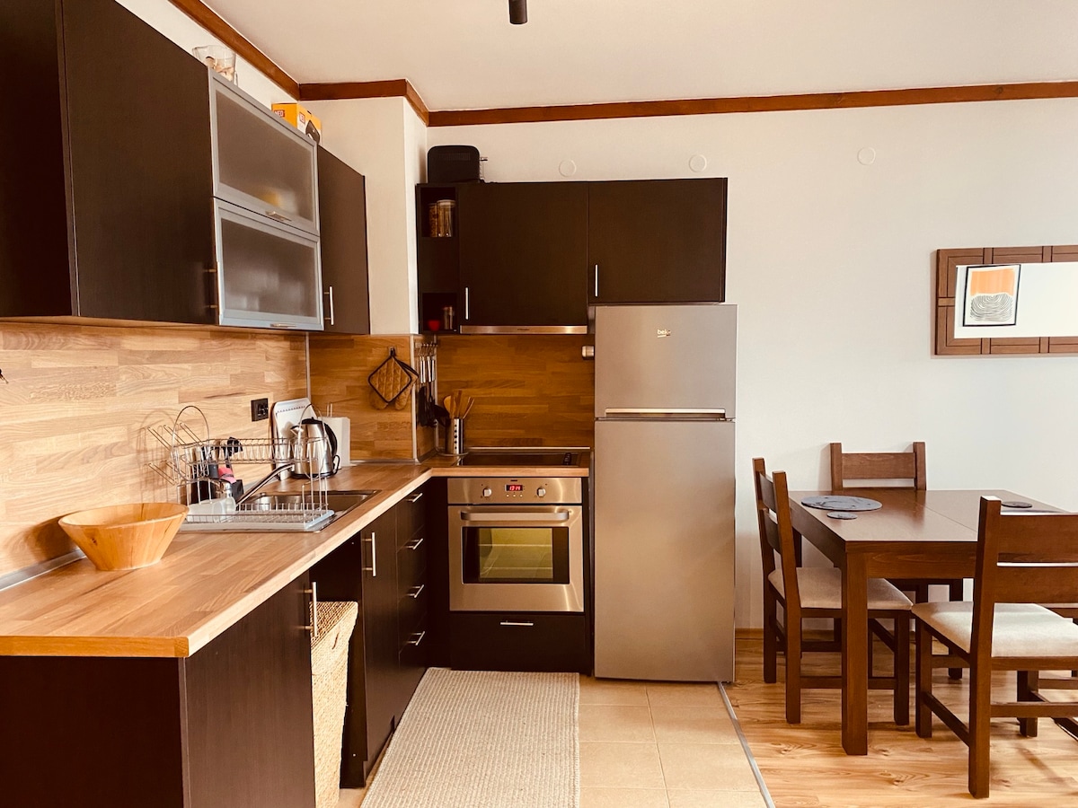Welcome to this modern and stylish Airbnb with stunning panoramic views of Bansko's Pirin mountains. The location is unbeatable, just 30 meters from the ski road, and a few minutes walk from Bansko's restaurant and apres'-ski strip. After a day on the slopes, you will find everything you need to unwind. A modern and fully equipped kitchen, underfloor heating, comfortable living area, and a Washer/Dryer. You can also make use of the 24hr free gym facilities. Looking forward to hosting you!