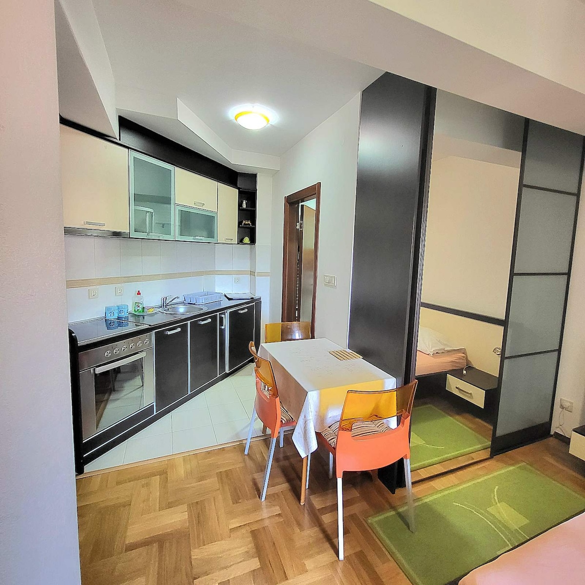 Bright and spacious condo located behind the main bus station in centar of Budva. The condo is a part of a new residental building, it is stylish and modern desin. 10 minutes walk to the sea coast, and 10 minutes walk to the Old Town. There are a lot of mini markets and supermarkets near by. You have a lot of restoraunts, fast food places, everything you need for a good stay is in the area of the condo. Internet is very good, 300/30 mbps perfect for digital nomads and video calls.