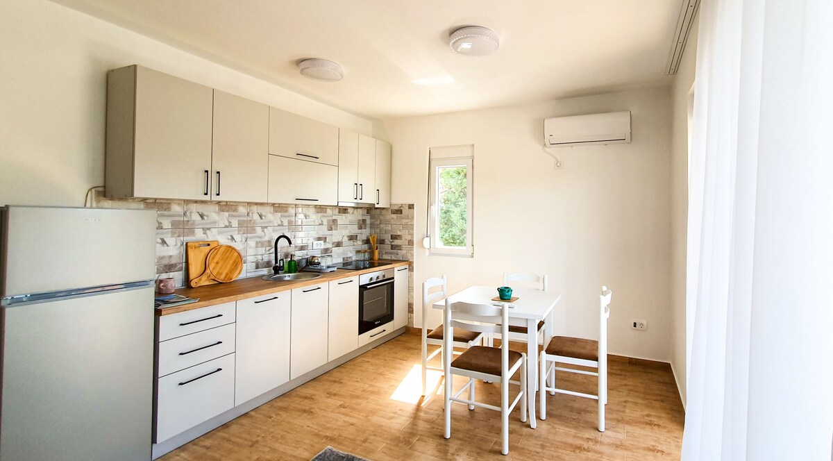 This beautiful, quiet, newly built apartment with air conditioning in every room and an amazing view of the sea is the perfect place to enjoy your visit to Bar! With charming furniture carefully designed to give it a homely and classic touch, you will truly enjoy your stay! Cleanliness is our specialty! It is located in a quiet street, 3 minutes' walk from the beach, shopping and attractions. Public transport is nearby so you can easily reach all the bar attractions