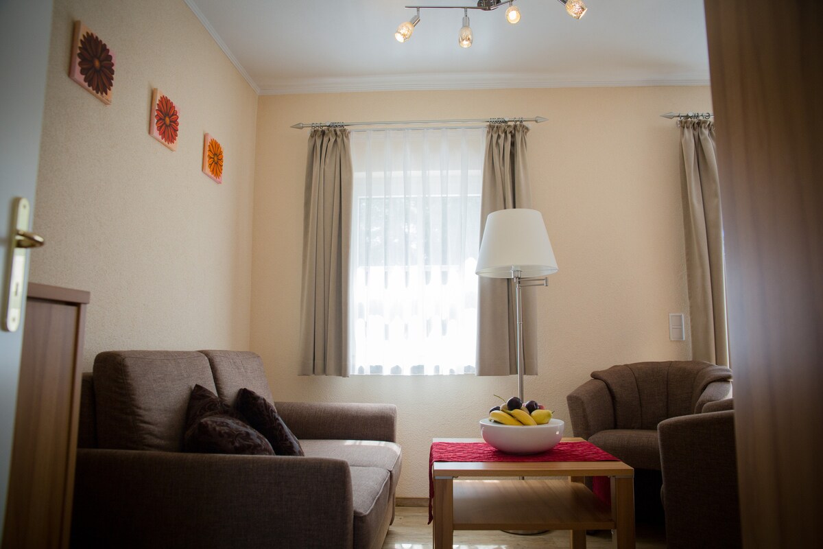 2-room apartment for 4 people. I am offering a lovingly furnished 2-room apartment on the 2nd floor with excellent Wi-Fi and a giant TV in a prime location, ensuring a pleasant stay and the best comfort. The apartment has a balcony, 2 large beds, a couch, and a giant sofa bed for maximum comfort. Perfectly located just one minute from the highway, undergrounds , and a two-minute walk from the Schlosscenter, great restaurants, bars, and shopping malls of all kinds. Price is for 4 person. ⭐️ ⭐️⭐️⭐️⭐️