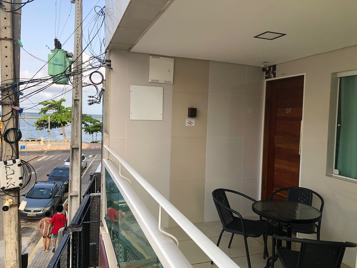 Beachfront apartment, with 160m², 1 covered/indoor garage (small/medium car). Waterfront in front of the building with a bike path and jogging track. Public transportation, shopping, restaurants, 5 km from the Pernambuco Convention Center, 7 km from downtown Recife and 3 km from the Historic Site of Olinda. All rooms with ocean views. Very clean and ventilated. Complete, bed, table and bath. Full kitchen. Good for couples, business travelers, families (with kids).