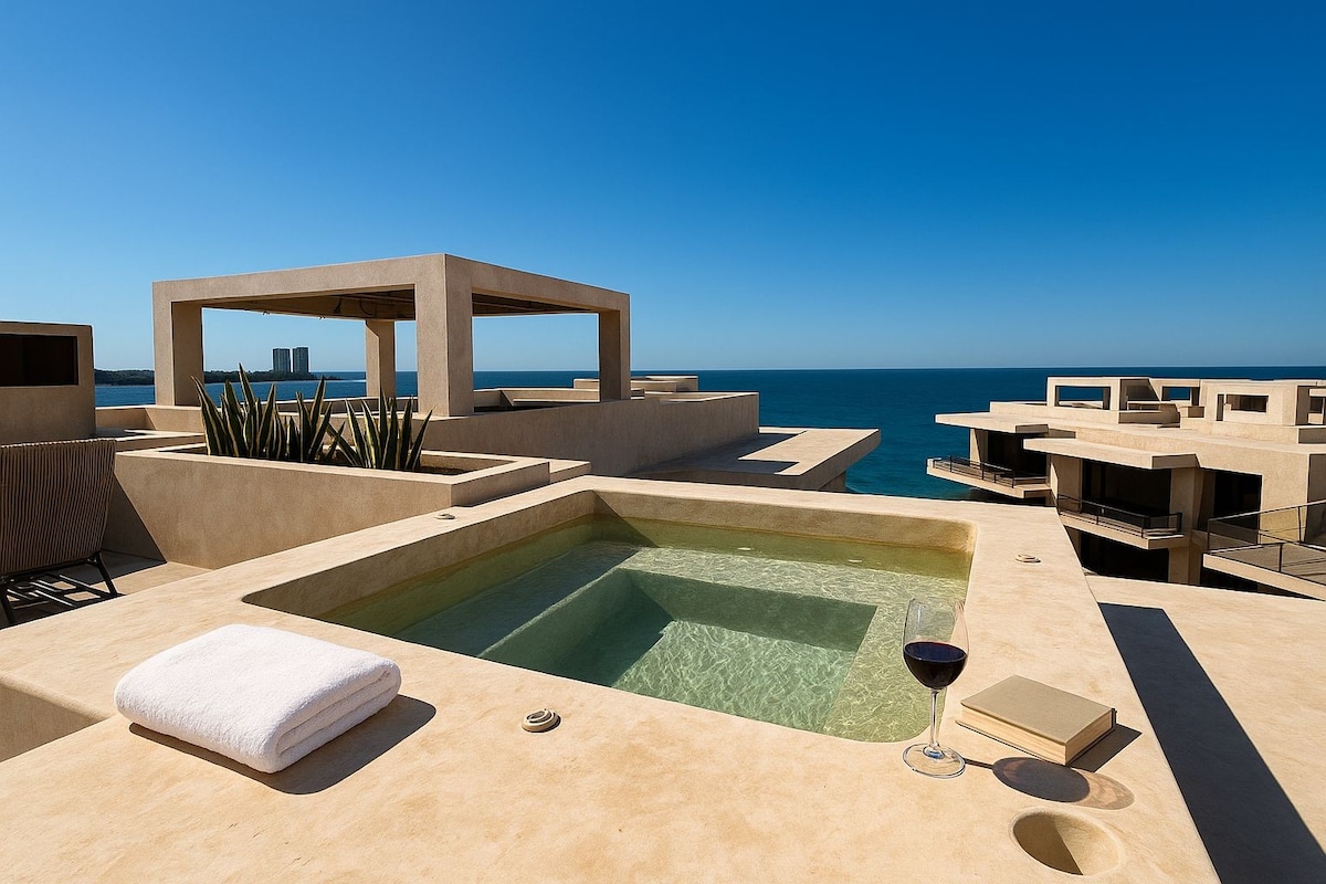 An outdoor balcony features a dining table accompanied by four woven chairs, with a view of the Pacific Ocean. A jacuzzi is positioned adjacent to the table, while the backdrop consists of vast water and a clear sky.
