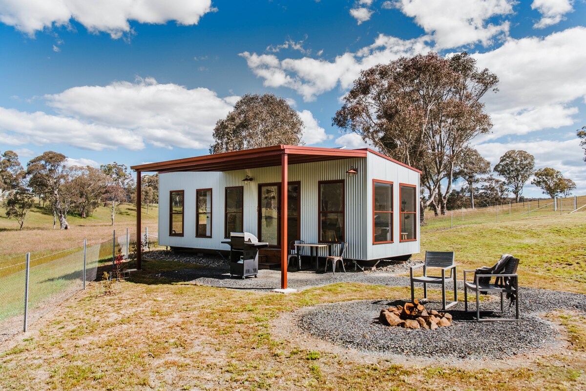 Wake to vineyard & paddock views, soak in your private baths beneath big country skies, and reconnect with the land in our thoughtfully designed, off-grid eco-studios. Each standalone studio offers privacy, panoramic glass, luxury curated interiors, and immersive views of BoxGrove’s working farm; complete with cows, lambs and alpacas. Note: • 'Hot tub' refers to 2 outdoor baths at the studio. • Views may vary slightly; images reflect Studio 1.