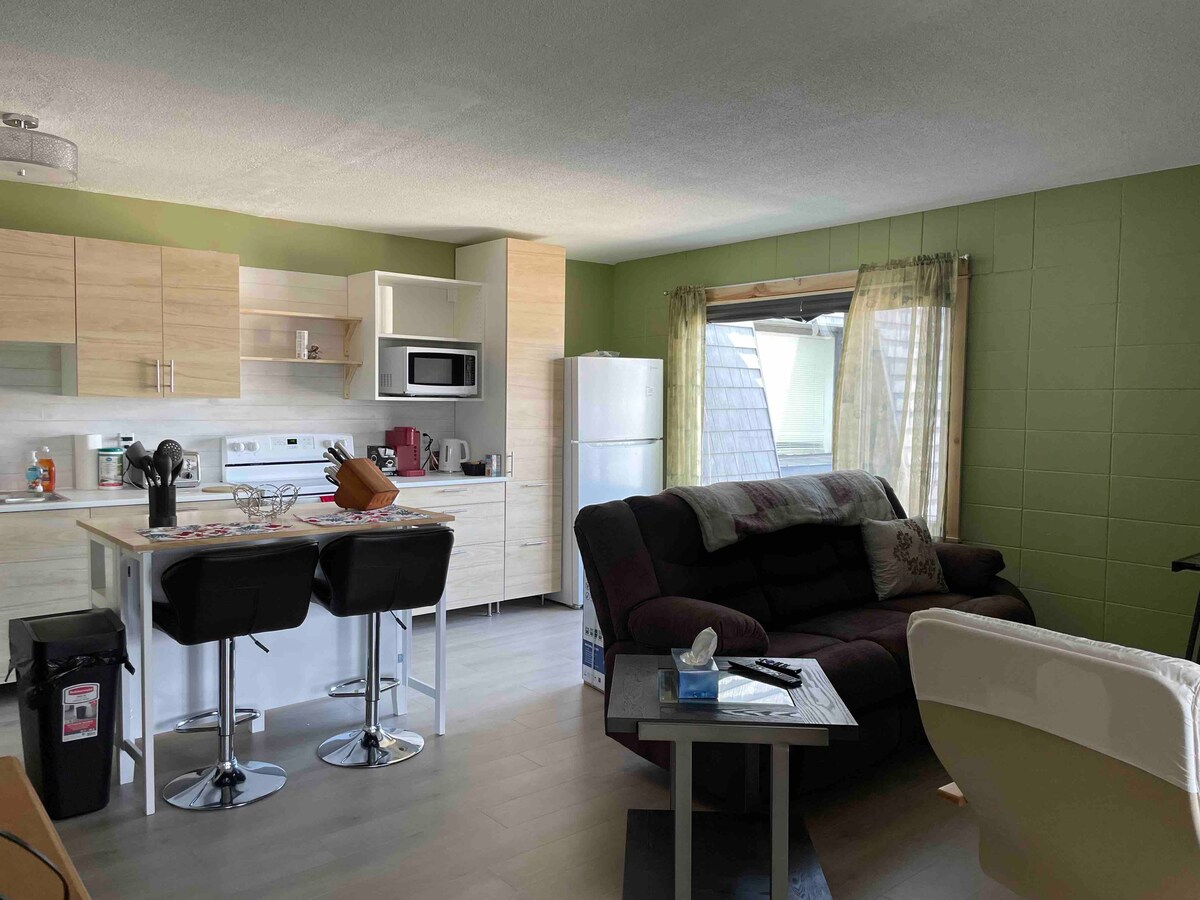 Enjoy a welcoming cozy Home away from Home, centrally located on main street. Air conditioned, clean, comfortable and fully furnished in a quiet building with only 4 units on 2nd floor. Walking distance to 24hr convenience store, groceries, Coop mall, restaurants, gas stations and easy access to all highways in/out of the city. Includes all utilities with wifi, cable and parking. Fully stocked kitchen, bedding, towels and its own washer/dryer and dishwasher. Discount for stays of 30+ days