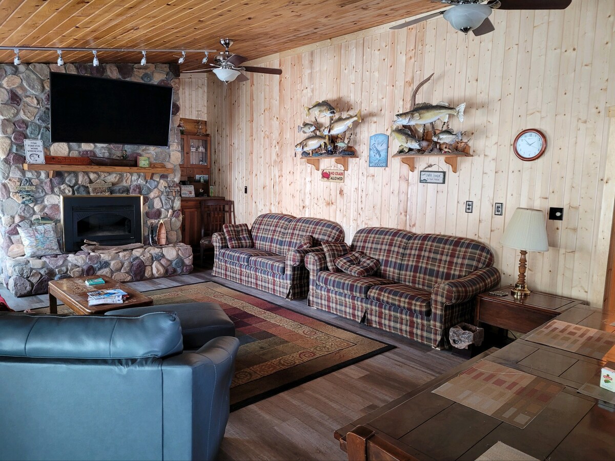 Direct river access. Boat slips available at zero charge. Dock your boat and walk inside! Make some memories at this unique and family-friendly place. Large windows overlooking Rainy River and private docks and access. Huge outdoor patio. Fish out the Front door! 6 beds, 3 beds in each bedroom. (3 double beds 3 single beds) plus 3 pull out couches, sleeps up to 9 if needed! 3 private docks for your boats. Outdoor grill on Huge Riverside Patio