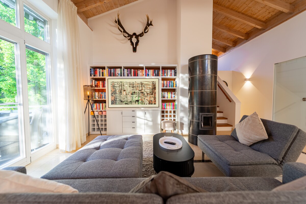 Stylish restored old barn in a stunning secluded location, offering 120 sqm of space with panoramic views of the countryside, a 50 sqm gallery with large windows, an infrared cabin, a walk-in shower, a bathtub, a luxury designer kitchen, terrazzo marble flooring with electric underfloor heating, a historic tiled stove from 1700 and a fenced garden for as many dogs as you like. A dream just 15 min. from Passau, 3 min. from the motorway, and 10 min. from the Danube. Bookable from Nov 2025