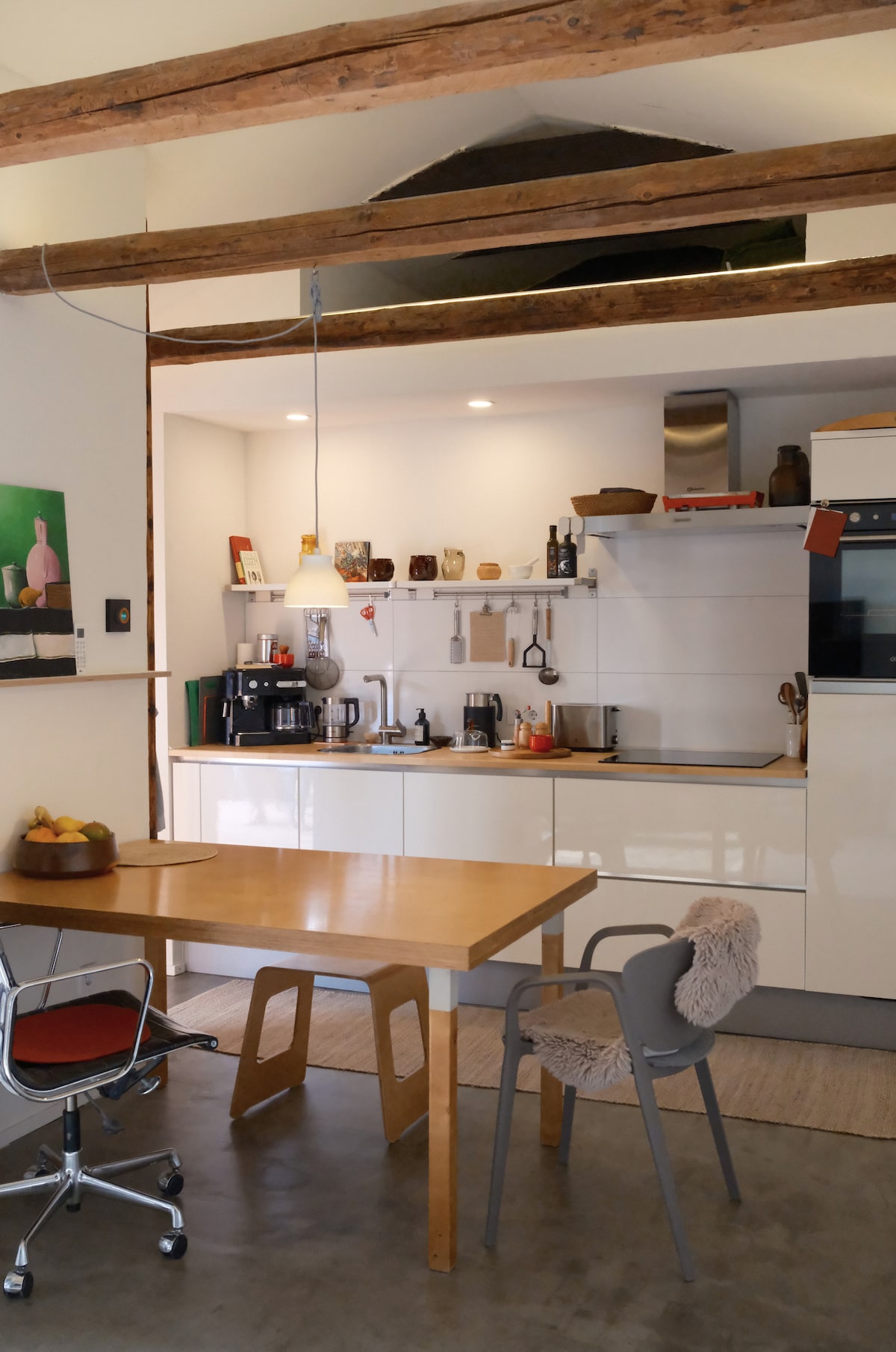 Surrounded only by meadows and fields, hidden behind the village pond, lies the small manor estate with its main house and old stables. For the past five years, we’ve been carefully restoring it, breathing new life into the 1899 estate. On the upper floor of the manor house – a brick building typical for the region – a spacious, light-filled 114 sqm apartment is waiting for you. The old beams are visible once again. The interior is simple and doesn’t distract.