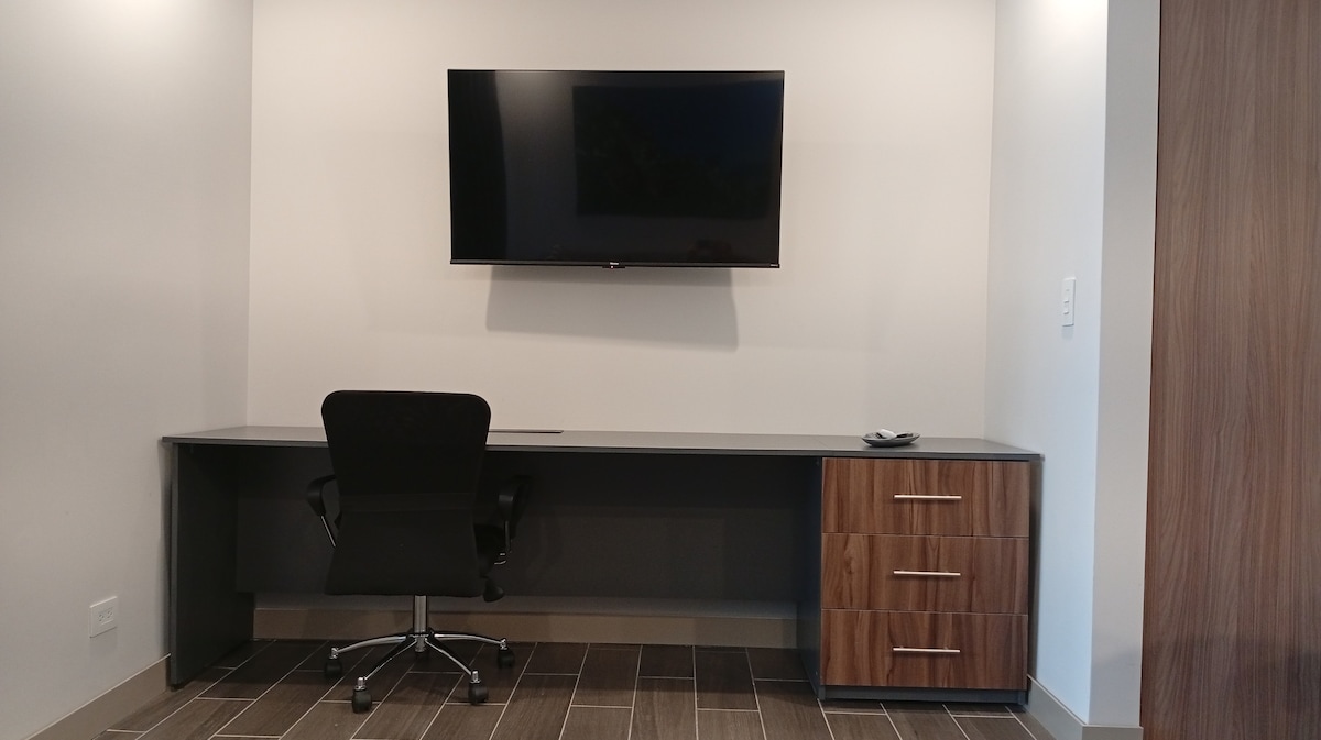 A luxury and large studio, just minutes from SJO International Airport. A very safe and centrally located , near to everything needed - walkable to International Companies in Trade Zones, La Sabana, Down town. Modern and full of amenities, it is very tastefully decorated. It features 1.5 bathrooms, a living area, a fully equipped kitchen, workspace, pool, Gym, SPA, etc. Relax on the balcony with seating to enjoy your coffee. Located in front of a main road, so some noise is to be expected.