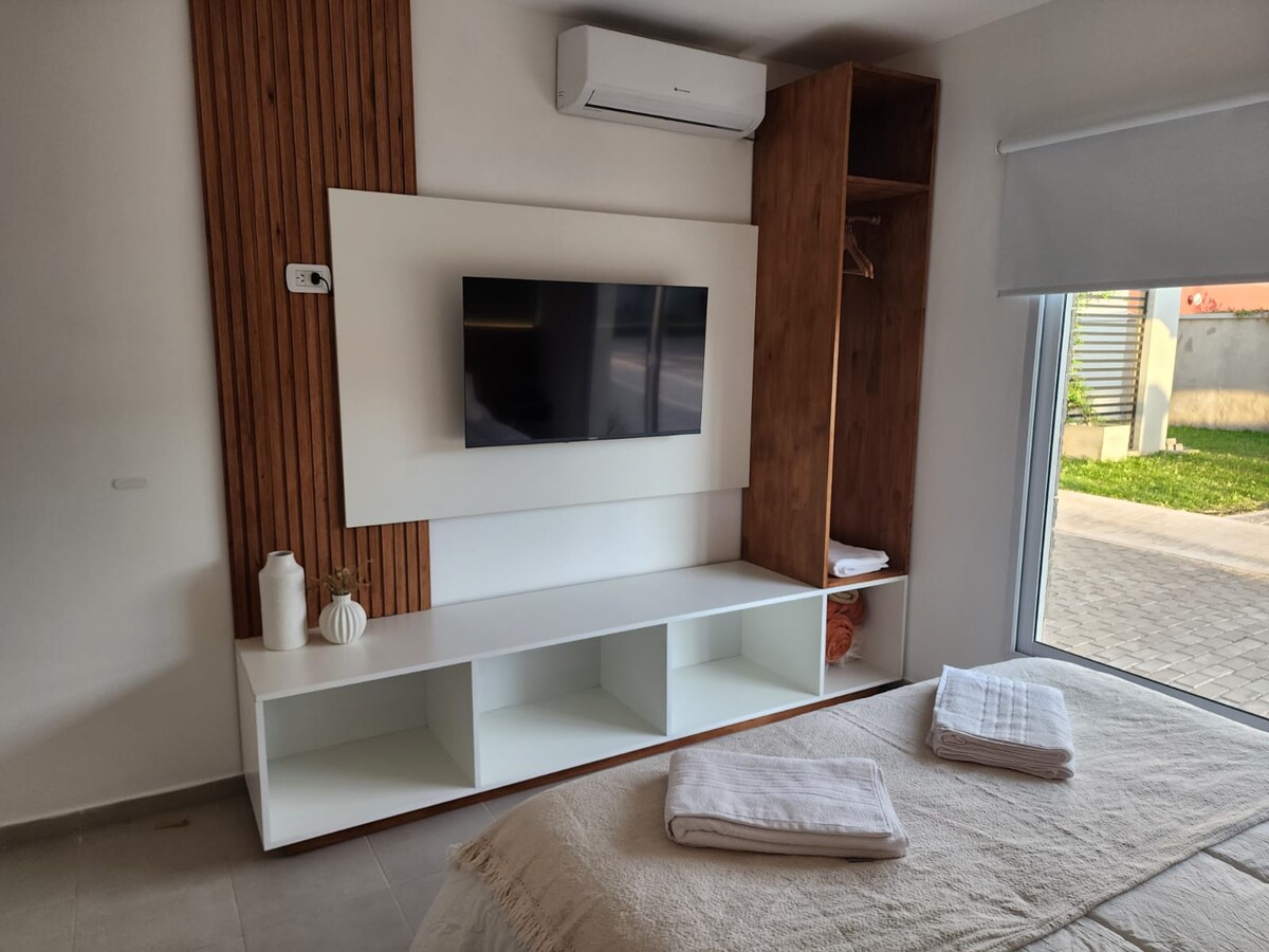 Beautiful brand new apartment. Ideal for relaxing with the family, just 1.3 km from the hot springs. The apartment has a bedroom with a queen-size bed, a full bathroom, and a beautiful patio to relax and enjoy with an independent grill. The apartment is in a gated community with a shared pool (COLD) and a separate garage. It comes with linens and towels. Towels for the pool or hot springs are not included.