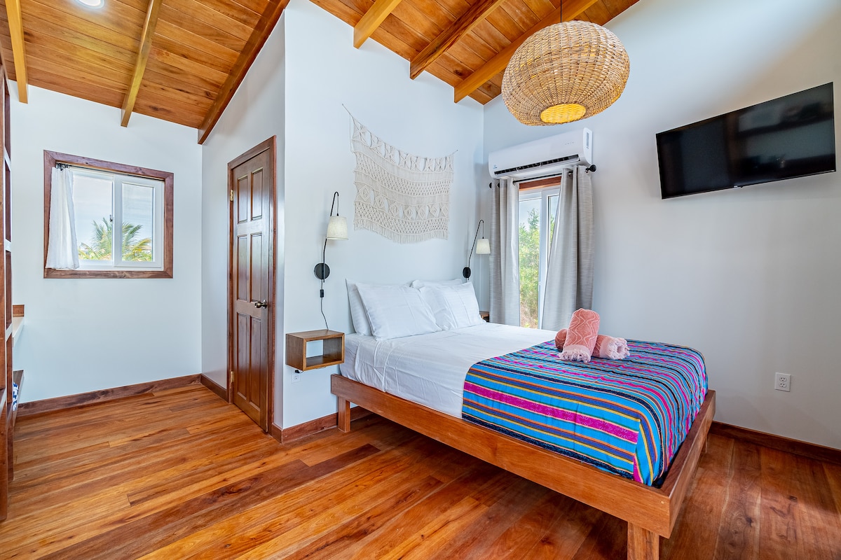 Secluded beach front property with 4 ensuite studio queen units on the northwest side of Caye Caulker. Just 1 mile north of The Split by foot or bike, or a 5-10 min boat ride if you prefer to arrange direct transportation to the property! This listing is for room #1 but see additional links for other rooms or the whole property, which sleeps up to 8! Kayaks, paddle boards, bikes & hammocks provided, plus an open-air shared palapa kitchen with bbq for grilling up your catch of the day!