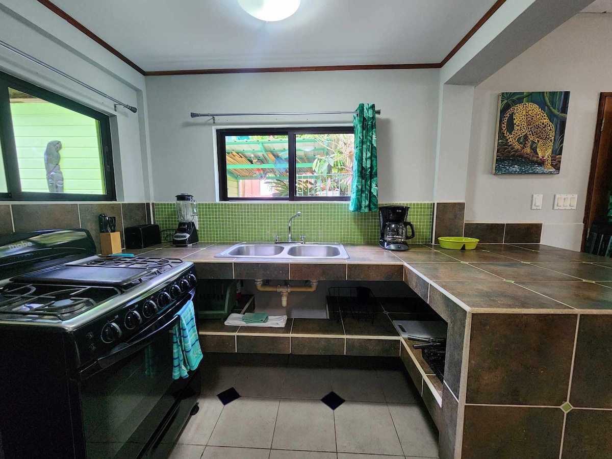 Casa Placencia's Toucan, w/12 ft ceilings & spacious living/dining room overlooking dipping pool surrounded by lush tropical gardens; my personal fav, very romantic. Paintings, including Walter Castillo & Rojas, custom tiled bathroom w/soaker tub. Equipped kitchen provides full size stove with oven, refrigerator, coffeemaker, toaster, blender. quality pots & pans, dishes & more for comfortable living. Queen bed, quiet air con, flat screen SMART tv, ceiling fans, FAST optic wifi & more........