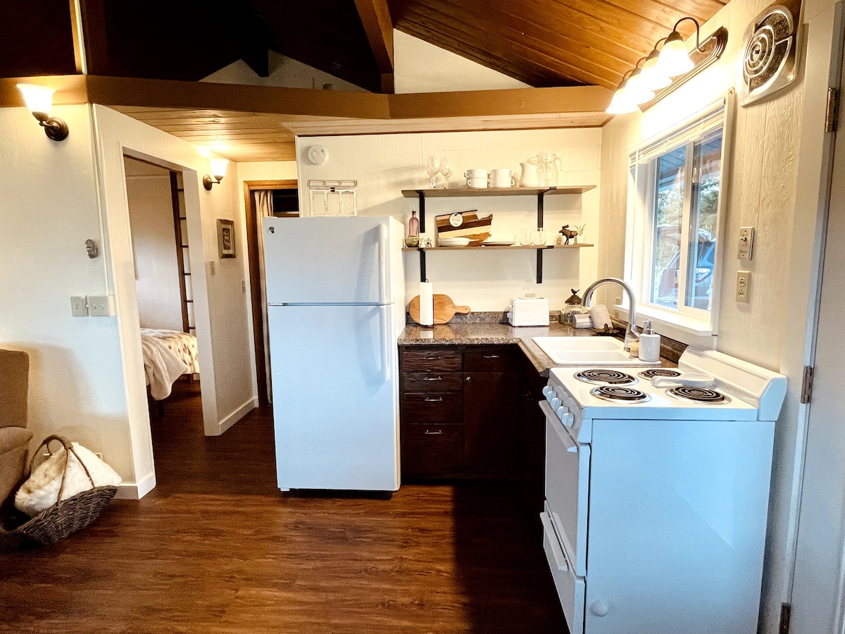 Welcome to Storybook Tiny home in serene Sequim, a cozy forest haven, featuring charming craftsman woodwork, a queen bed, a private bathroom with a new flushable toilet, a kitchenette with a microwave, and a propane fireplace for a snug atmosphere. Enjoy the outdoor patio with a firepit, relax in the 104 degree hot tub. Observe local wildlife. Just a short drive to Sequim's shops,hiking trails and near Olympic National Park, the perfect blend of rustic charm and convenience for your getaway.
